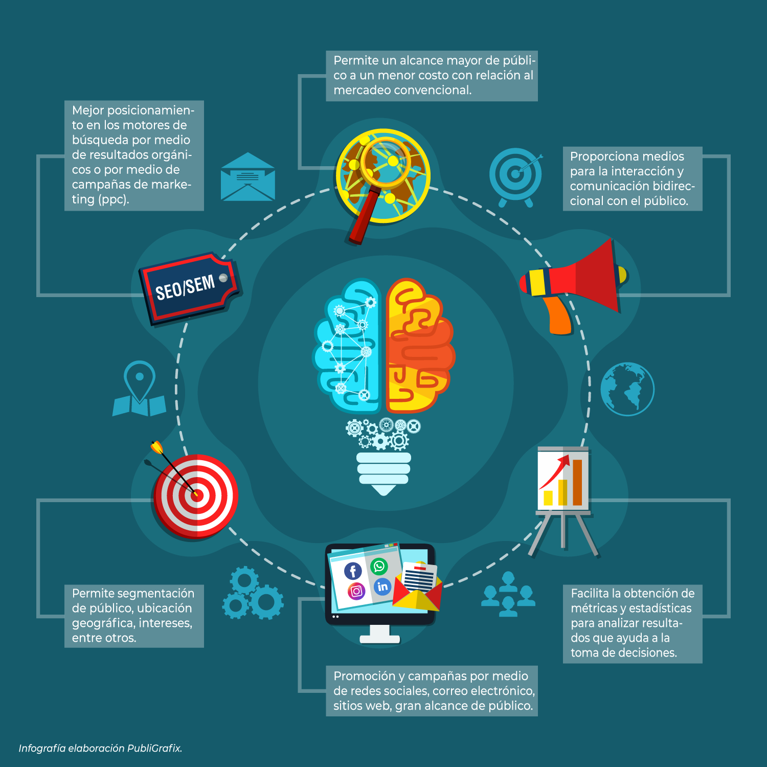 El marketing digital sin duda alguna tiene un gran auge de la mano con el posicionamiento del internet en todos los aspectos de nuestra vida. En Publigrafix por medio de diversas estrategias, permite que marcas, productos y servicios tengan presencia en los medios digitales como: redes sociales, páginas web, motores de búsqueda, correo electrónico, entre otros.